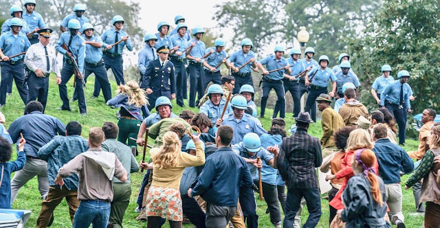 What Happens: First, we see grainy news footage from the mid-1960s of President Lyndon B. Johnson increasing monthly draft call-ups (more U.S. soldiers for our increasing involvement in the Vietnam War, pitting us and the government of South Vietnam against invasion from rebellious Viet Cong and North Vietnam military), followed by other quick footage of Martin Luther King Jr. standing against this war, assassinations of King and Presidential-candidate Robert F. Kennedy in 1968, the draft lottery of late 1969 (coincides with the Chicago 7 trial, September 24, 1969 to February 18, 1970; among many other sources if you’re interested, you can read a short recap of its events or a much more extensive summary [I was still an undergrad at the U of Texas at Austin during the originating chaos of 1968 that led to the trial, then had to participate in that draft lottery where I was fortunate—unlike so many others of my generation—to get a number in the 300s so I was never called up; for those who were, I have the highest respect for the men drafted against their will, those who didn’t come back alive, all those who did return to be rejected by their nation]). We then get quick vignettes to introduce us to most of the 8 defendants—Tom Hayden (Eddie Redmayne) and Rennie Davis (Alex Sharp), co-founders of the Students for a Democratic Society (SDS); Abbie Hoffman (Sacha Baron Cohen) and Jerry Rubin (Jeremy Strong), leaders of the International Youth Party (Yippies); David Dellinger (John Carroll Lynch), leader of the National Mobilization to End the War in Vietnam (MOBE); Bobby Seale (Yahya Abdul-Mateen II), National Chairman of the Black Panther Party (the other 2 were academics, Lee Weiner [Noah Robbins] and John Froines [Daniel Flaherty], whom we don’t see until the trial begins)—accused under the Rap Brown Law (also known as the Anti-Riot Act, crossing state lines to incite a riot [attached to the 1968 Civil Rights Act, the specter of its use again in 2020 by current Attorney General William Barr]) of instigating the riots that occurred at the 1968 Democratic National Convention in Chicago, even though A.G. Ramsey Clark under the outgoing Johnson Administration declined action against the protesters, convinced the Chicago Police caused the riots (footage shows CBS TV news anchor Walter Cronkite [often during this period called "the most trusted man in America"] saying the riots were in a “police state”).